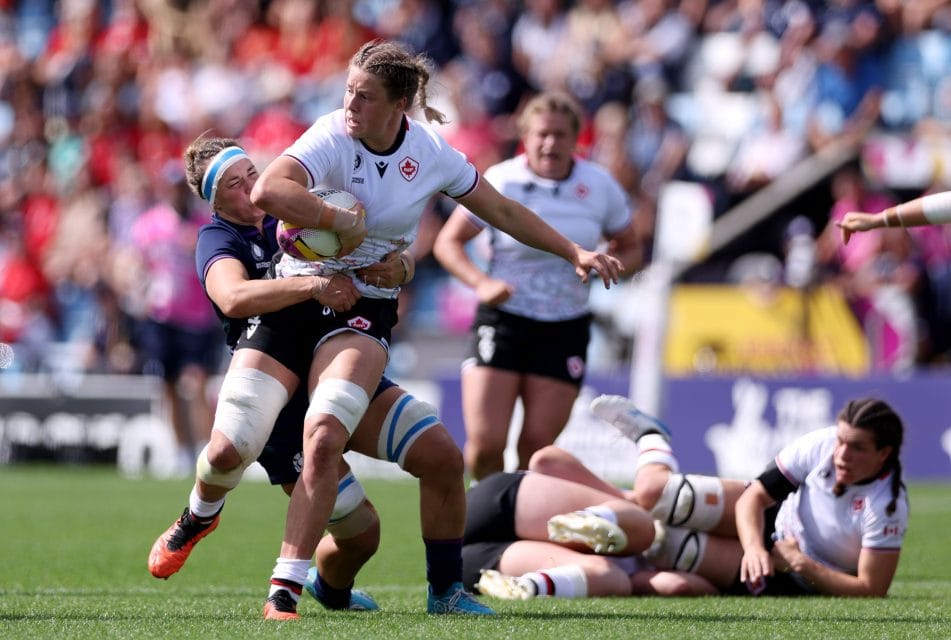 Rachel Malcolm is pictured making a tackle versus Canada – thanks to World Rugby