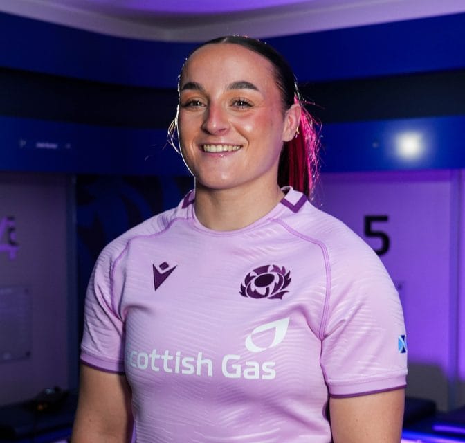 Scotland No.8 Evie Gallagher is pictured in the new kit thanks to Scottish Rugby