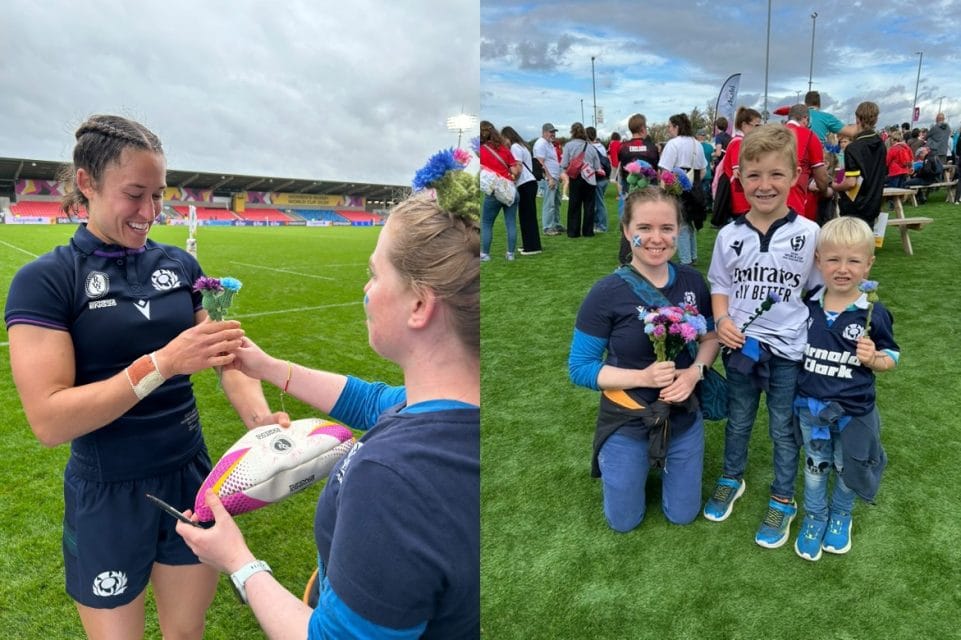 Graham was at the Salford Community Stadium in Manchester watching the Scotland versus Fiji Women’s Rugby World Cup Pool B match and she became one of the stars of the show pre-game as fans found her to pick up their thistles and she was also spoken to by the BBC and World Rugby’s content channels.